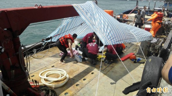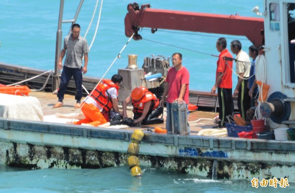 落海遊客被漁船救起時,已癱軟無生命跡象。李光濱攝